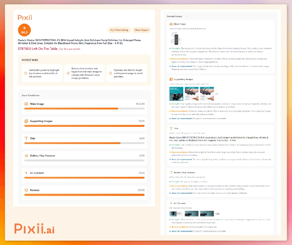 Pixii’s Amazon Listing Grader tells you what’s wrong with your listing and what you can do to improve it.