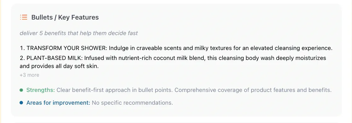 Bullets bridge the gap between interest and purchase. Shoppers who read them are already leaning in, and your job is to reinforce their decision, not overload them. A tight, benefit-first bullet list keeps the momentum going and makes clicking “Buy Now” feel like the natural next step.
