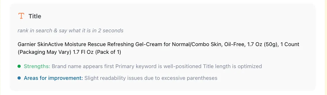 Front-load your brand and primary keyword, follow with the essentials that matter most to shoppers, and keep it clean, scannable, and compliant.