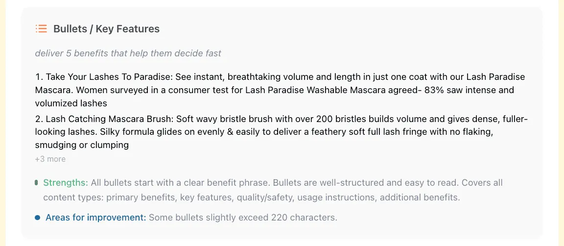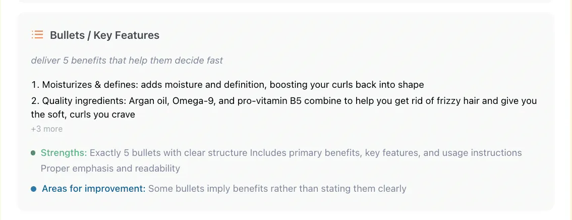 Bullets bridge the gap between interest and purchase. Shoppers who read them are already leaning in, and your job is to reinforce their decision, not overload them. A tight, benefit-first bullet list keeps the momentum going and makes clicking “Buy Now” feel like the natural next step.