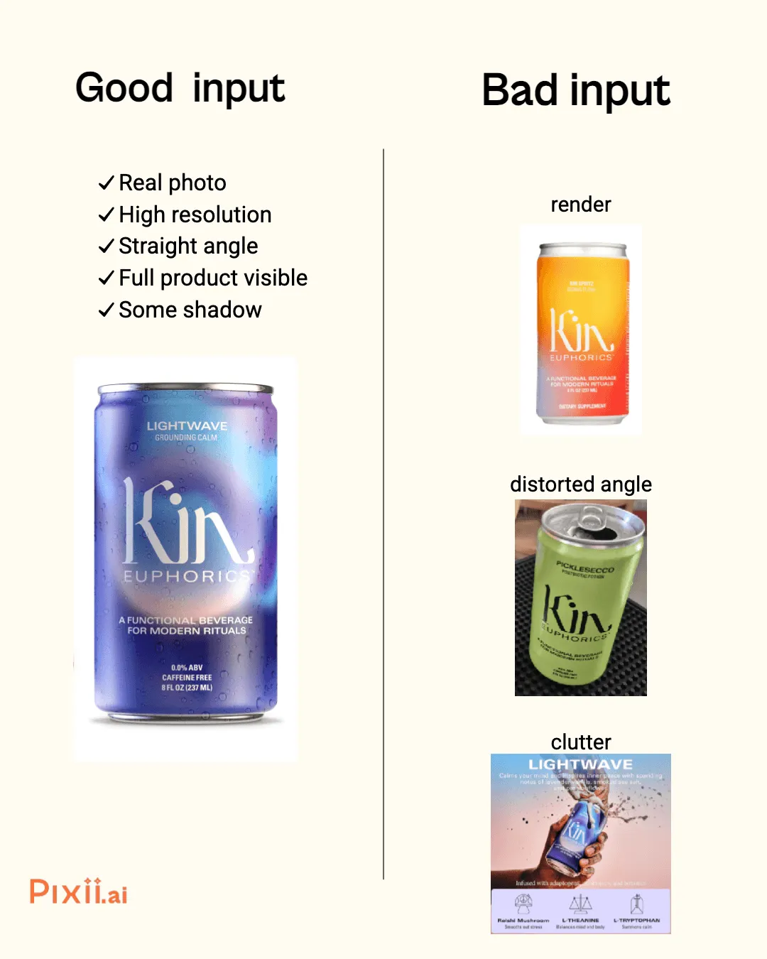 - Blurry, pixelated, or low-res Pixii can’t find edges or fine details, resulting in mushy outputs, distorted packaging, and missing text.